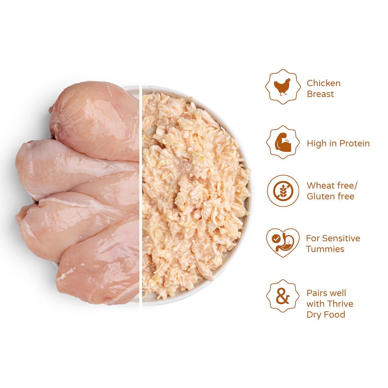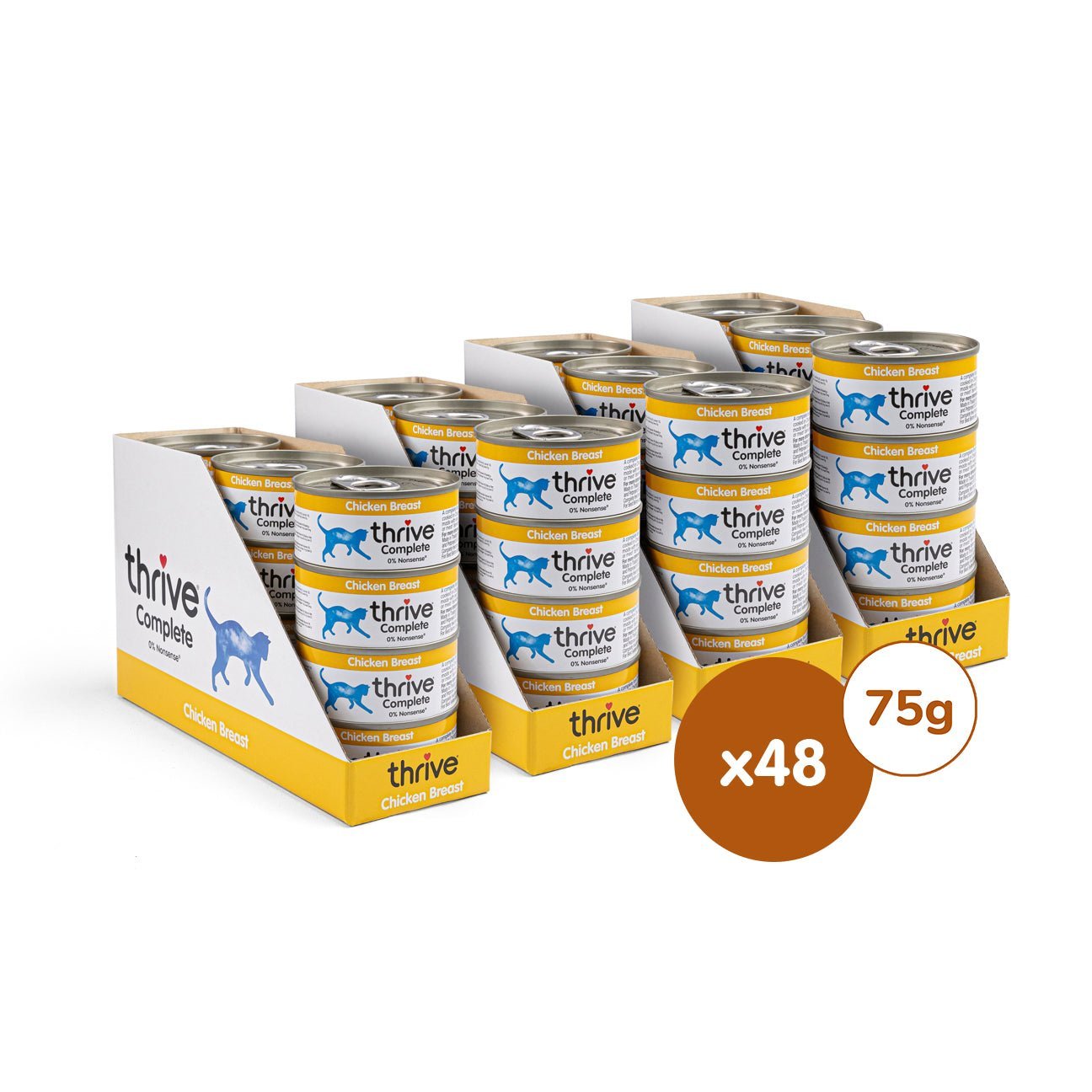Made with chicken breast as the only source of protein. Thrive Chicken Breast Complete wet cat food is cooked in chicken broth with added vitamins and minerals to give your cat a complete nutritionally balanced meal. This food is complete. which means it can be fed on its own or with our Thrive PremiumPlus dry food. depending on your cat’s preference.